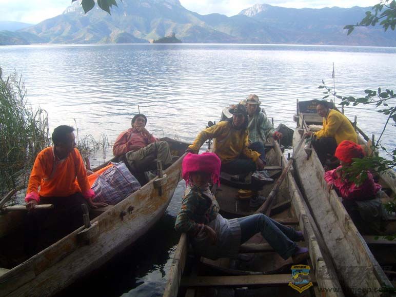 为我们划船的是三个摩梭小伙子,我奇怪地问,不是说你产摩梭男人都不用干活吗?他们笑着说,湖面上起风了,女人们爱美,怕被风吹黑就不出来划了。看来,摩梭男人和女人们的传统角色正在悄悄地发生转换。据说,有些摩梭人的婚姻形式也从我们这些外人所艳羡的走婚制改成婚姻登记制了。% _1 E* d- o5 Y t5 t I( G