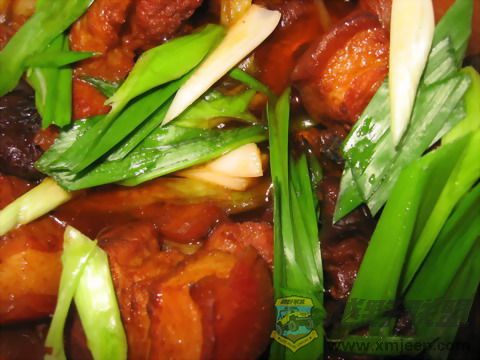 备料:食用油少许,三层肉,香菇,青蒜,料酒,姜料,蒜头,糖,酱油,厦门肉酱罐头少许