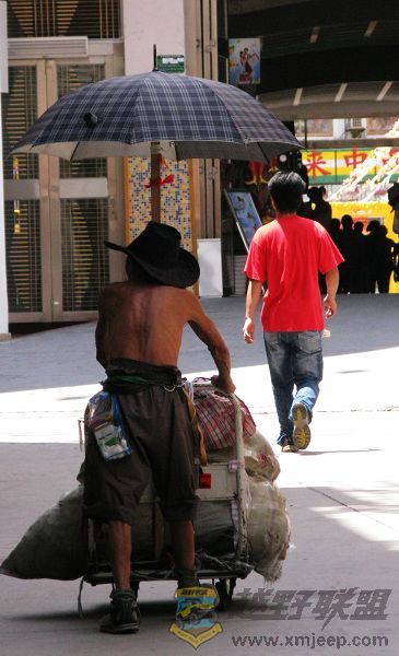 头上的伞是拾荒者的吗???