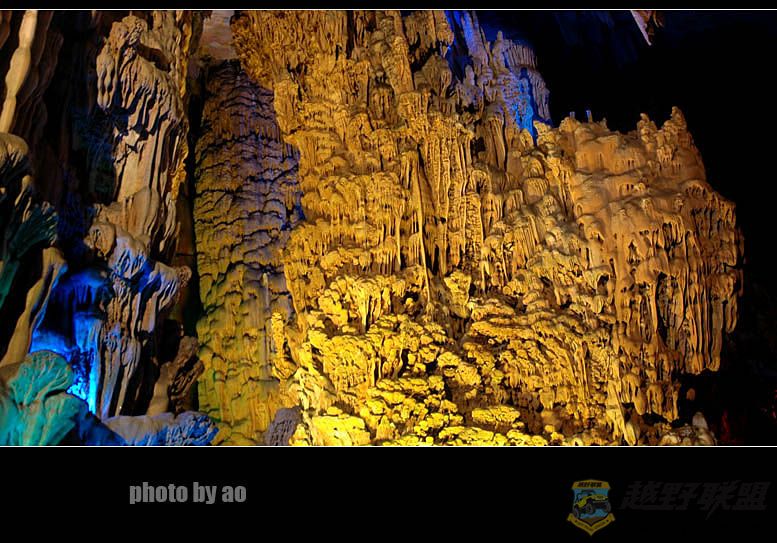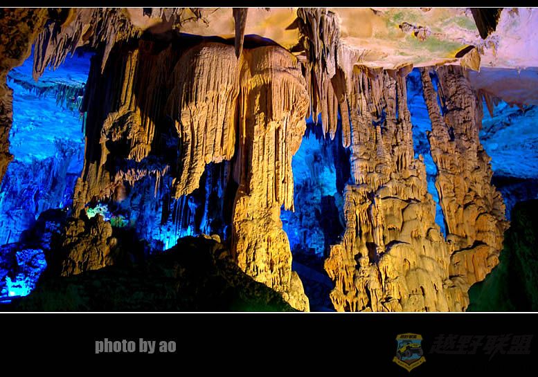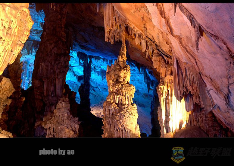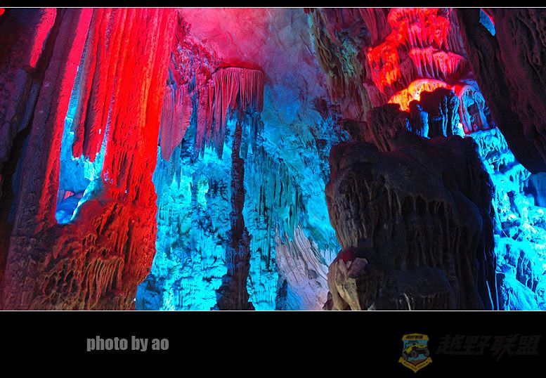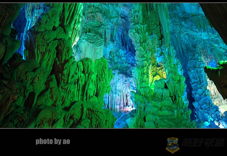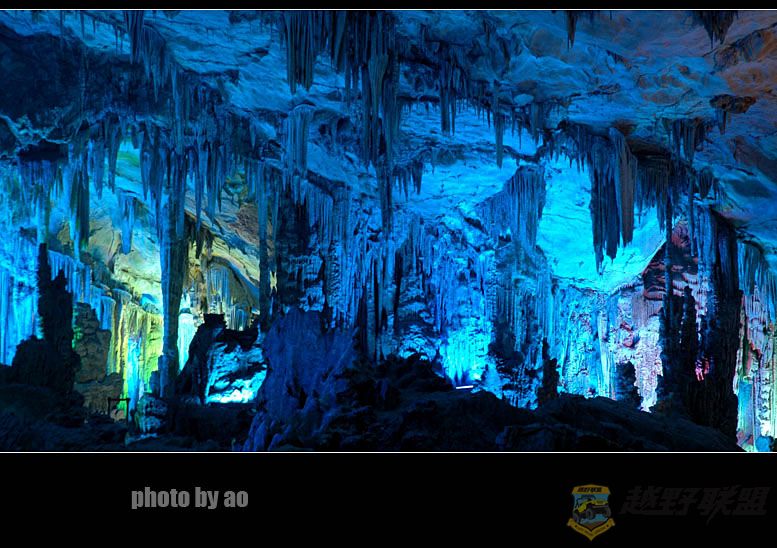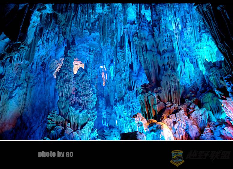芦笛岩的确是我所见过溶洞中最为华丽的一个,印象最深的也是水晶宫中的瑶池美景,其在灯光的作用下散发出迷幻的色彩,犹如月宫天穹,蓝色的天空倒影在水中,背景里的岩石如山峰直刺苍穹,水中点点渔火如漓江的晚唱,道不尽洞中的风流,让人痴迷让人陶醉。