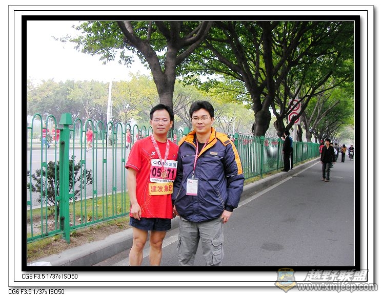 ( ~3 P( w/ d* t# Q g; e7 V+ T/ {5 d先生跑完20公里后挂着奖牌与他的哥们张。