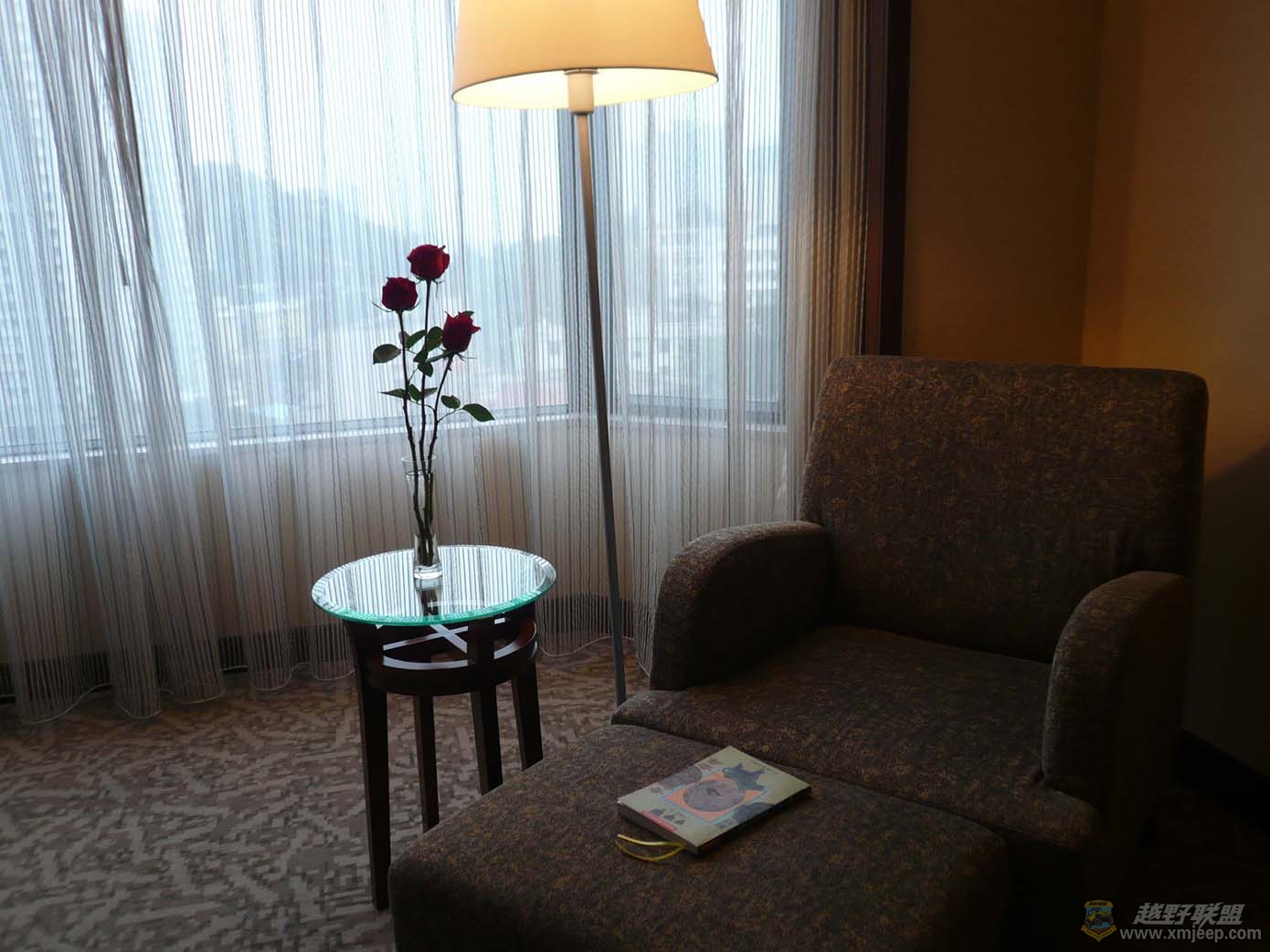 ( R% h$ M# w j: ^: j L& j 作为入住的VIP客人,我只在前台出示了身份证就可以了,随后有一位酒店工作人员陪同我到房间中办理相关入住手续,彰显对贵宾的尊重。推开厚实的新装修升级的商务房房门,我的眼球立即被一扇巨大的落地观景玻璃窗所吸引。半透明的蕾丝纱窗,恰到好处地在拒绝外面的喧嚣进入的同时又让你可以地细致入微地尽揽鹭岛风情。这个时候,我由衷地赞叹酒店选址的绝佳和前瞻性了。她位于厦门老城区的最中心,同时又是老城区的制高点之一,再加上她二十二层的挺拔身材,使得她可以几无遮拦地环视厦门的海光山色了。