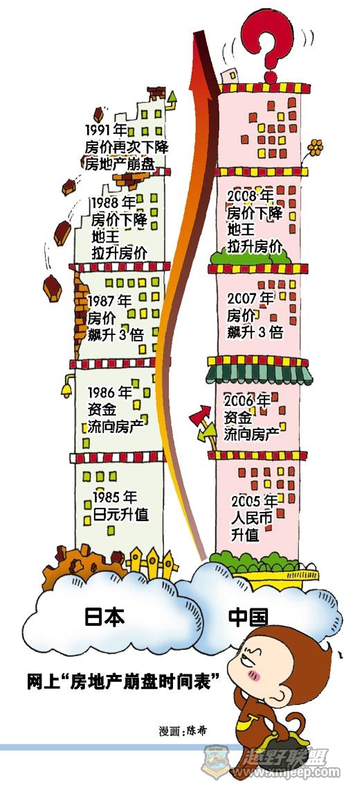 房地产频遇调控,一份“房地产崩盘时间表”也开始在网上流传。它回顾日本1985年~1991年房地产市场走势,发现与中国2005年~2008年房地产市场走势颇为相似,最后更预言中国房地产会在明年崩盘。然而,多位专家却表示,两地银行体系、人口结构、城市化程度不同,“崩盘”可能只是“预言” 而已。 : M- W6 V+ I; o* J