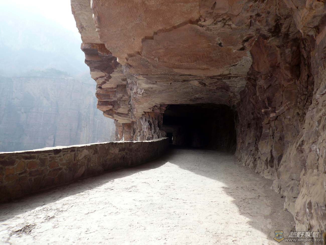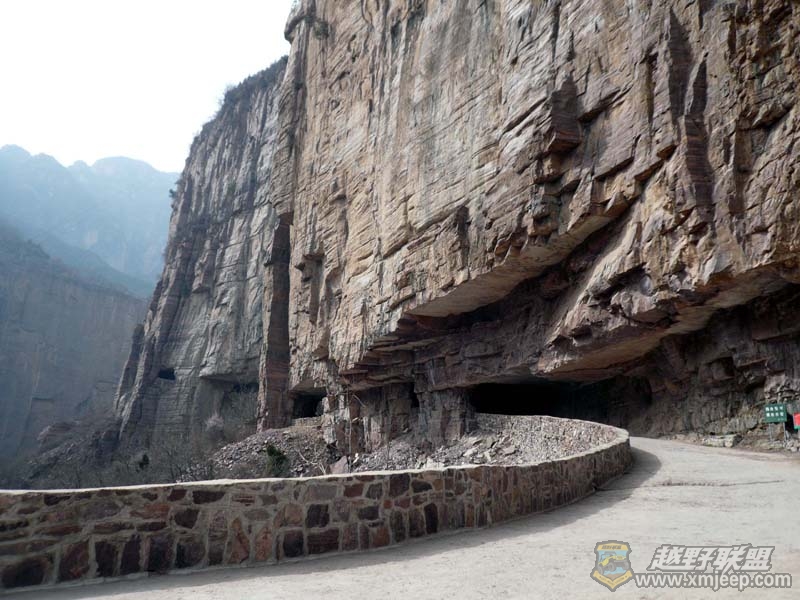 ) s; Z# s' }, `2 }9 h7 _9 W1 ^走了不久,就看到山路正前方出现一个黑黝黝的**嘴似乎的巨大山洞,著名的郭亮村绝壁长廊公路到了!自古以来,困守太行山顶的郭亮村人出门只能通过近乎垂直的天梯,不方便且极危险。1972年,郭亮村党支部书记申明信带领村里的其他12名勇士,用绳子绑着身体,从几百米高的山顶悬到峭壁的半空中,打烂4000把八磅铁锤,消耗12吨六棱钢钎,村里的羊、大树全部卖光,一位年仅三十来岁的生产队长王怀堂甚至付出了生命。经过六年的苦战,他们终于在太行山坚硬的山体中打出一条长1300米,高4米,宽6米的隧道。愚公移山只是传说,郭亮村的绝壁隧道却是真真实实的动人风景。郭亮村前辈先人这种战天斗地的奉献牺牲精神,永远值得我们敬重!