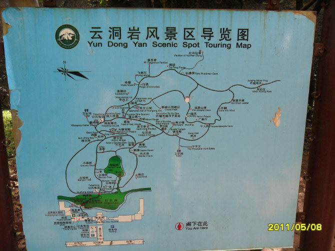 走入山门,这山门横匾上“云洞古刹”是张人希先生题写。古刹建于宋朝,重修于清光绪乙未年,古刹殿前有“桃花崖”、以及石刻“入我门来”,殿前木刻“云居岩”等。大殿供奉三宝佛,即正中的释迦牟尼佛、左侧的东方药师佛、右侧的阿弥陀佛。相传古殿中有暗道可通云归洞和梅花石室。