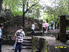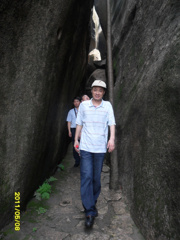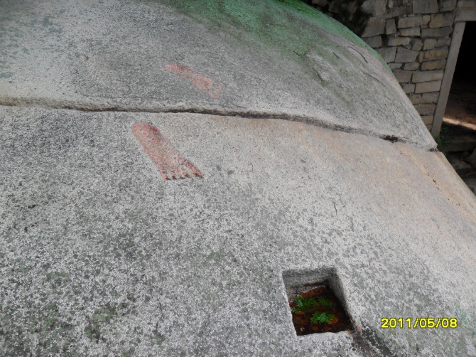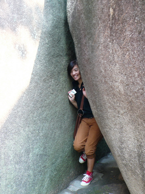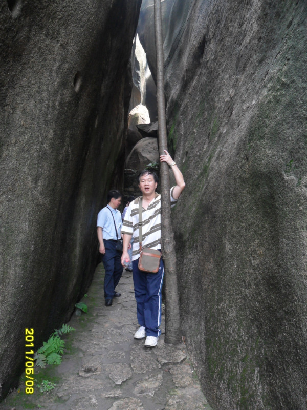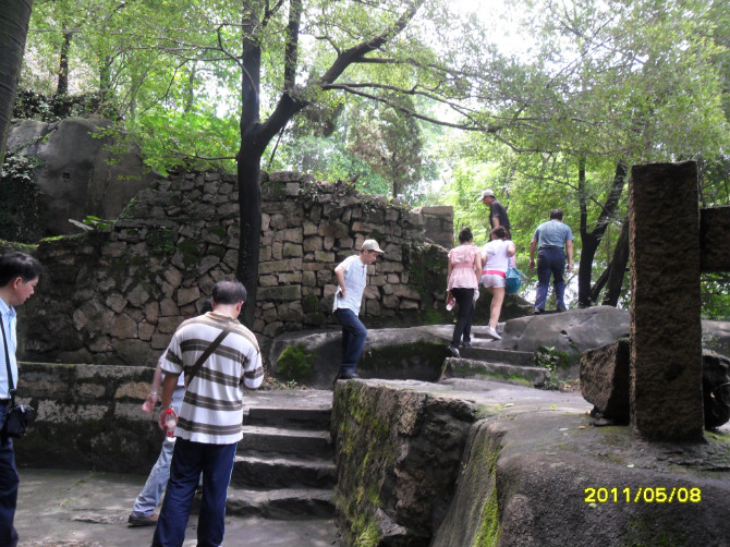 我们一直沿山路而上,便是“诵芬亭”、“得朋石”。“得朋石”系两巨石相依互拥,如两位至友促膝谈心。因丰熙久慕蔡烈的风范,特地到云洞岩造访,两人一见如故,成为莫逆之交。丰熙在此流连忘返,逗留了半年多,留下了不少墨迹。丰熙题“得朋”两字,以纪念他和蔡烈的友谊。丰熙终于老死于戍所,蔡烈的墓地也就在“鹤室”附近。0 D' L+ { N% H2 C/ o