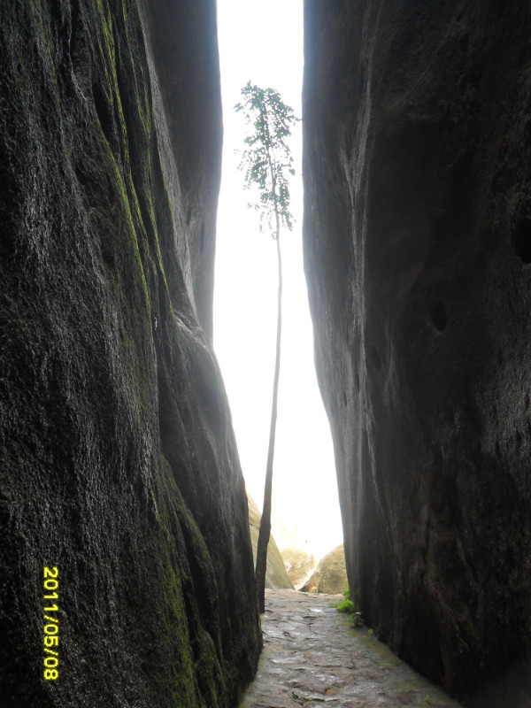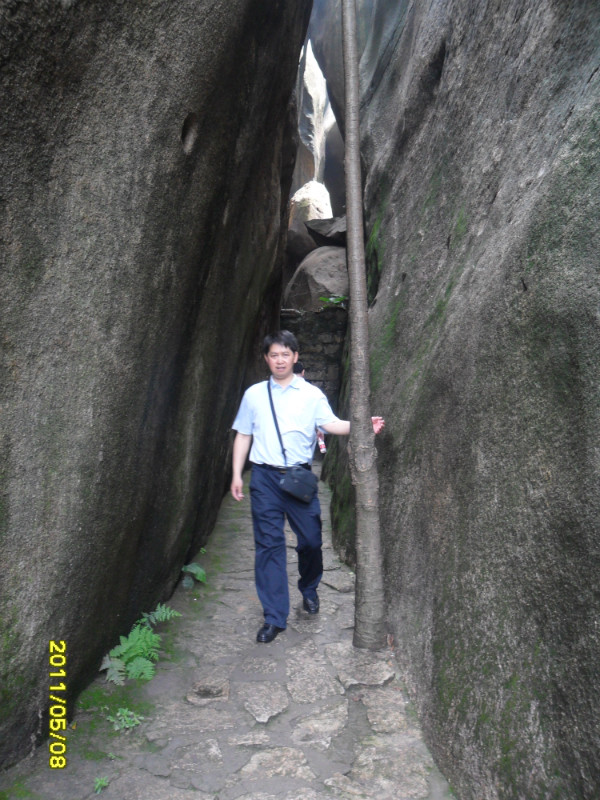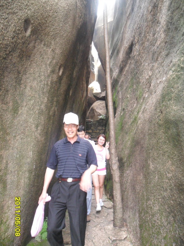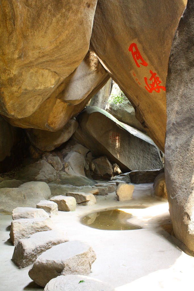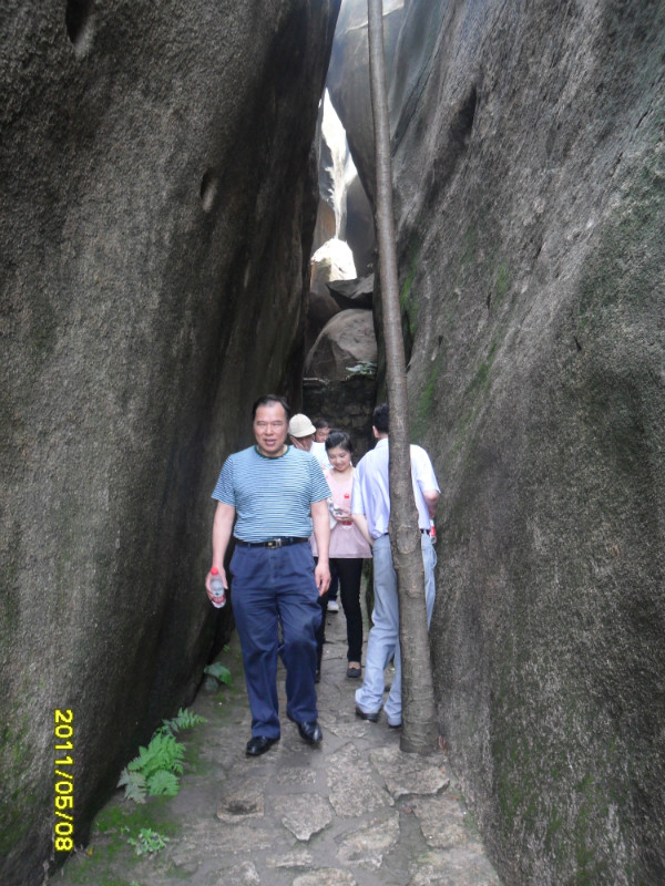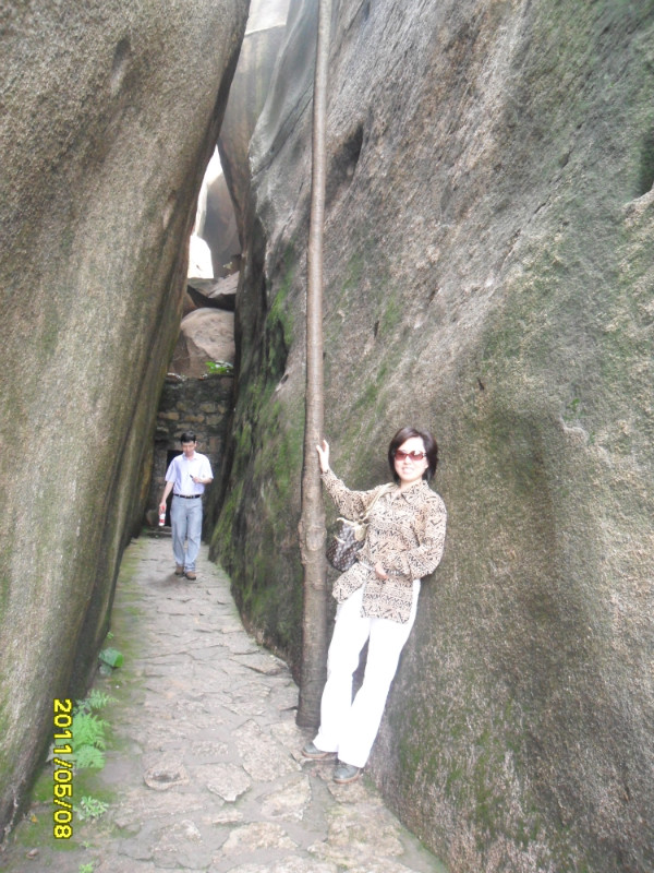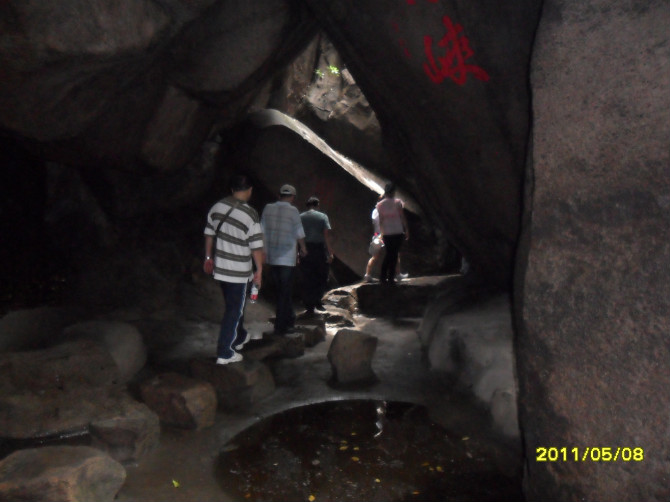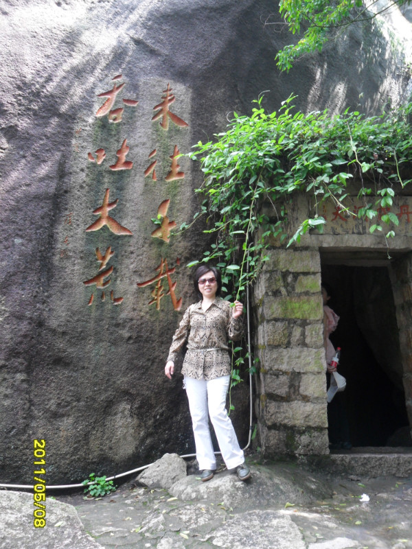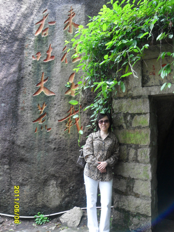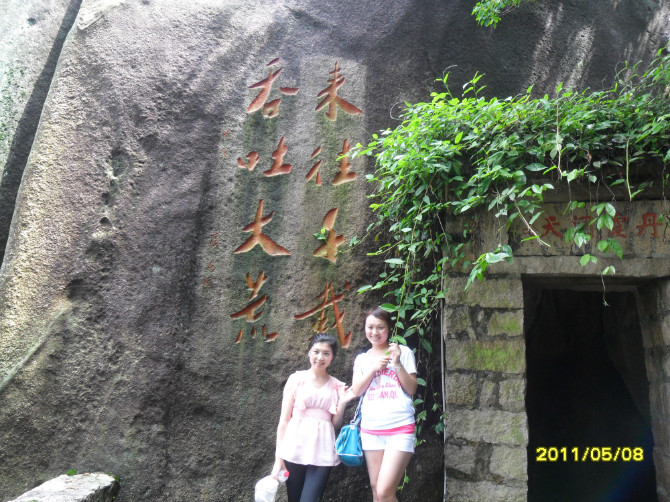 我们继续登山,往左便到北宋仙亭,折回可达仙樵洞、霞陆云丘、福寿、朱子祠。接下来我们去“霞窝”。关于“霞窝”的名称,有个传说:相传远古时王母娘娘曾在此设蟠桃宴会酬谢众仙,酒酣之际命月霞、春霞、秋霞、冬霞诸仙女起舞助兴,此处故名“霞窝”,又名“仙岛”。这两字“霞窝”就是明朝嘉靖翰林大学士丰熙根据民间传说而题写的。宋代理学家朱熹曾慕名登岩览胜,他被山上名胜折服,便在“霞窝”峭壁的巨石上,挥笔写下“溪山第一”四个大字。+ U, c6 t# l( q9 K6 r