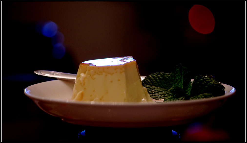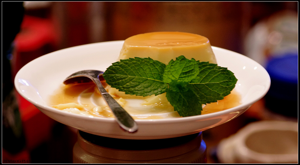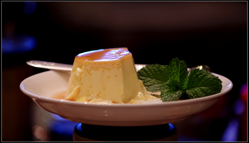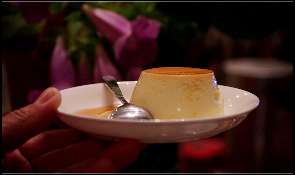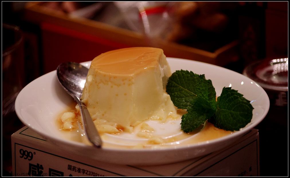 其实女儿平时很少跟我们出门的,昨天听说要去熊嫂家看花草,很感兴趣,带着刚买的“宾得kr”单反机说去拍照。。。因为是夜晚,室内灯光不算昏暗也很温柔。。。虽然可以使用闪光灯拍照,但那样画面太平淡,所以花草就没拍成了。。。但却被熊嫂的美食诱惑了,当蛋挞、布丁端上桌,我们正要下手时,女儿就把我们喊住了:“等等,我拍完再吃吧”。。。哈,一向很挑剔的她,今天都被熊嫂的手艺征服了,我们还能说什么呢?吃,不停地吃,不停的拍,这就是对熊嫂的最大赞赏。。。看到有粉丝拍照,熊嫂毕竟是修过艺术的,赶忙跑到阳台摘了几瓣香草点缀在布丁上。。。但为时已晚,可怜的布丁已经缺失了一大半。。。